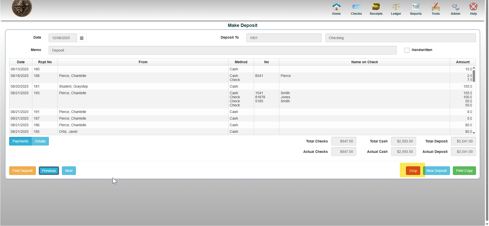 - Once you are on the deposit you wish to undo, click DROP to completely delete the deposit as if it was never completed