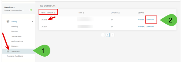 4. The dates are formatted "YEAR-MONTH" – As an example we are looking at 2025-05 for May 2025. The download button is on the right-hand side. This will give you the Merchant Statements showing the activity.