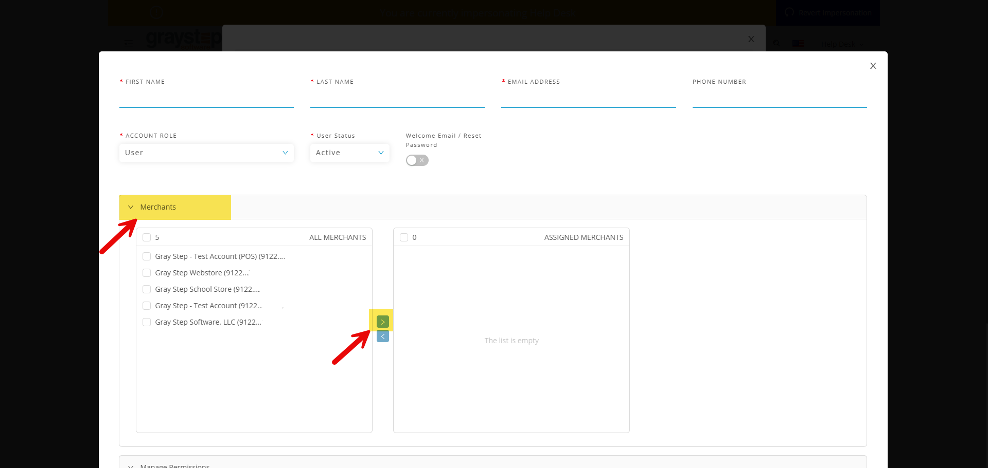 After selecting which MIDs you’d like to assign to the new user, you can also Manage Permissions to control what they’re able to do within the Merchant Dashboard.